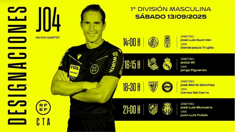 9月12日讯 本周末,西甲联赛将重燃战火,西班牙足协官方公布了当地时间9月13日4场比赛的裁判安排。其中,赫苏斯-吉尔执法皇马客战皇家社会,穆努埃拉主裁马竞主场迎战黄潜。